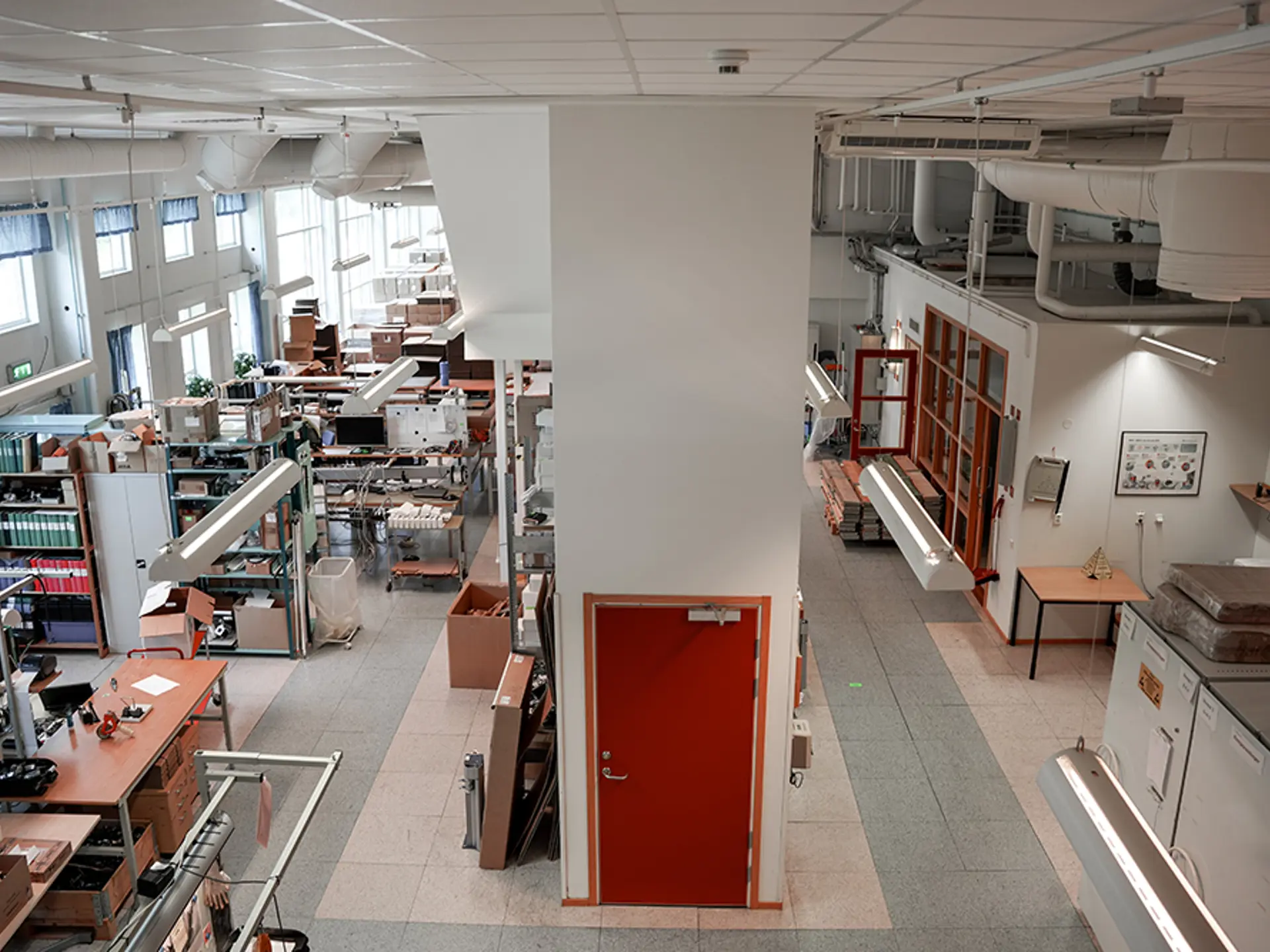 På loftdelen finns ett fikarum och kök med öppen utsikt över produktionsytorna, vilket skapar en trivsam pausmiljö och ger god överblick över lokalen.