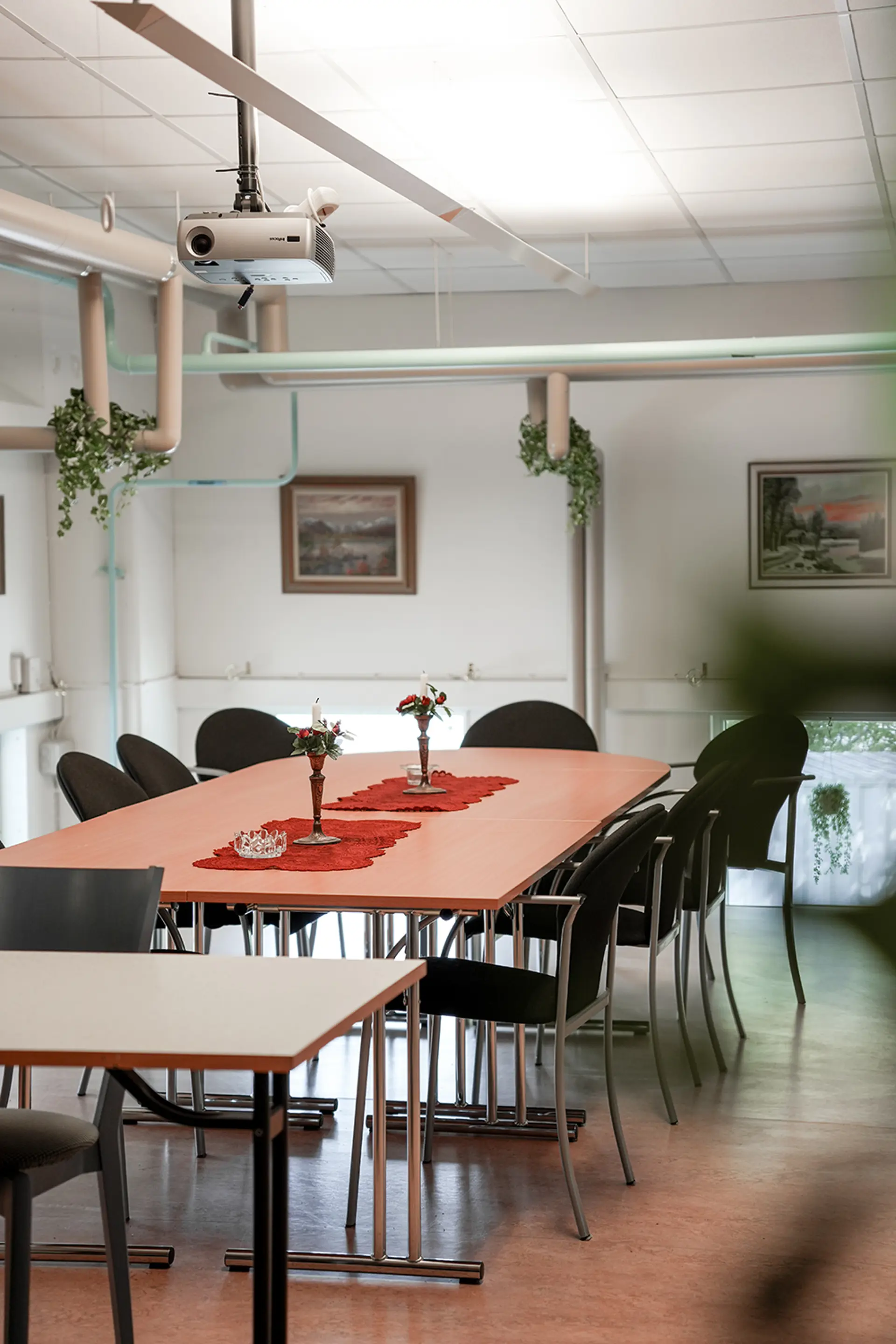 På loftdelen finns ett fikarum och kök med öppen utsikt över produktionsytorna, vilket skapar en trivsam pausmiljö och ger god överblick över lokalen.